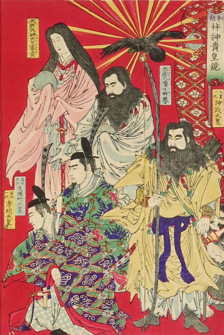 Όρθια αριστερά η Amaterasu κρατάει τους «τρεις ιερούς θησαυρούς»,